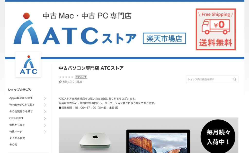ATCストアは中古パソコンを専門に扱うショップで、中古MacBookなども販売しています。オンライン販売が中心で、楽天市場などでも購入できます。